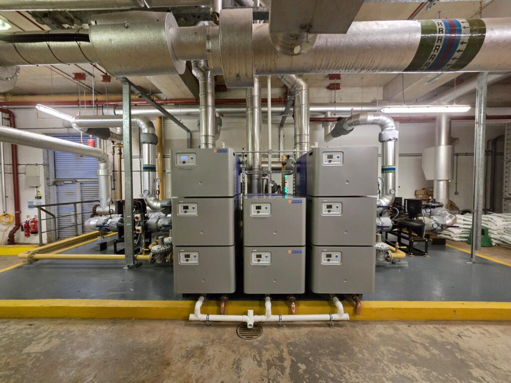- Installation of 6 × 252kW Hamworthy ModuMax boilers, configured into two 756kW duty modules